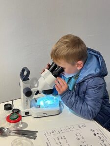Ein besonderer Augenmerk lag auf der Station, an der Bodenlebewesen in der Erde entdeckt werden konnten. Die Kinder hatten die Möglichkeit, mit kleinen Schaufeln und Bechern nach verschiedenen Organismen zu suchen. Unter Anleitung konnten sie ihre Funde dann unter Mikroskopen betrachten, was für viele kleine Forscher ein faszinierendes Erlebnis war.
